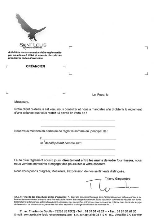 - La lettre est à l’en-tête de Saint Louis Recouvrement,